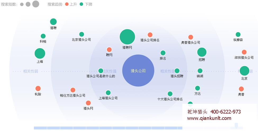 北京知名獵頭公司乾坤獵頭通過百度大數據平臺,分析了全國范圍內的百度用戶在2015-11-09 至 2015-11-15期間,通過百度搜索關鍵詞獵頭公司一詞的需求情況,得出的上圖,圖中大圓表示強烈,小圓表示相反,綠色表示在下降,紅色表示在上升,越靠近中間獵頭公司一詞,相關性越強,反之越弱。